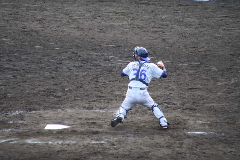 この日スタメンキャッチャーの細山田も間合いを外す事も多い。